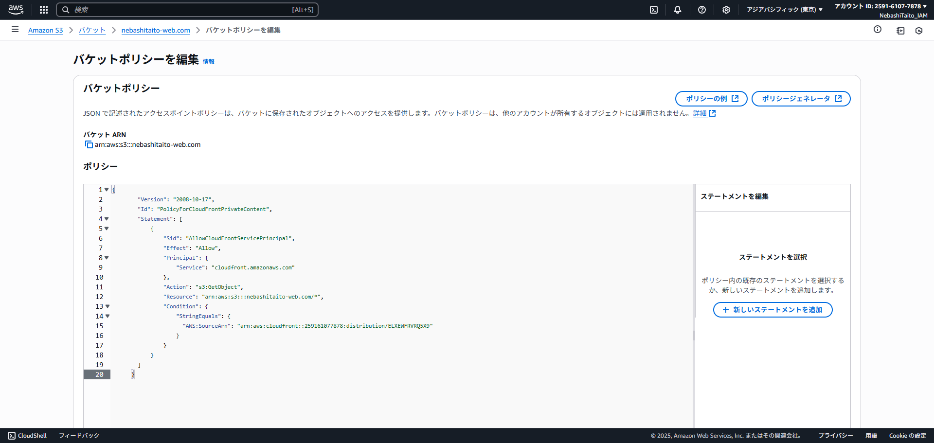 コピーしてきたバケットポリシーを貼り付けて、CloudFrontからのアクセスを許可する。